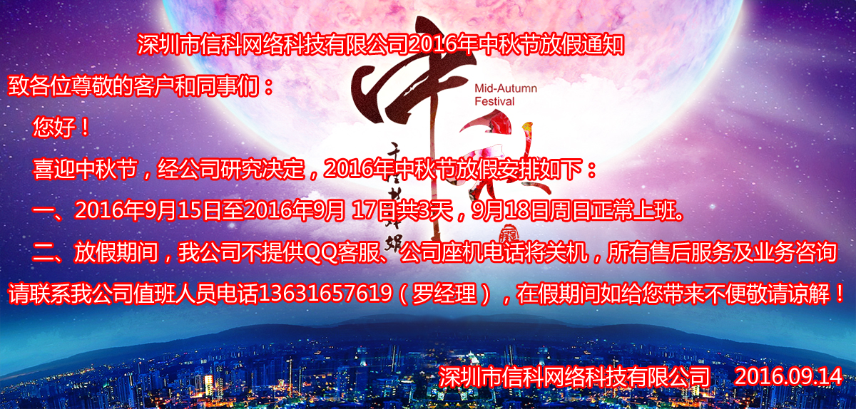 深圳市信科網絡科技有限公司2016年中秋節放(fàng)假通知(zhī)