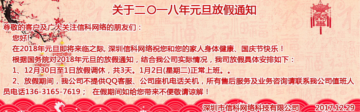 在2018年元旦即将來(lái)臨之際, 深圳信科網絡祝您和(hé)您的家人身體健康、國慶節快(kuài)樂!感謝(xiè)您一直以來(lái)給予