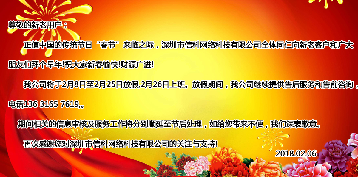 正值中國的傳統節日“春節”來(lái)臨之際,深圳市信科網絡科技有限公司全體同仁向新老(lǎo)客戶和(hé)廣大(dà)朋友們拜個早年!祝大(dà)家新春愉快(kuài)!财源廣進!