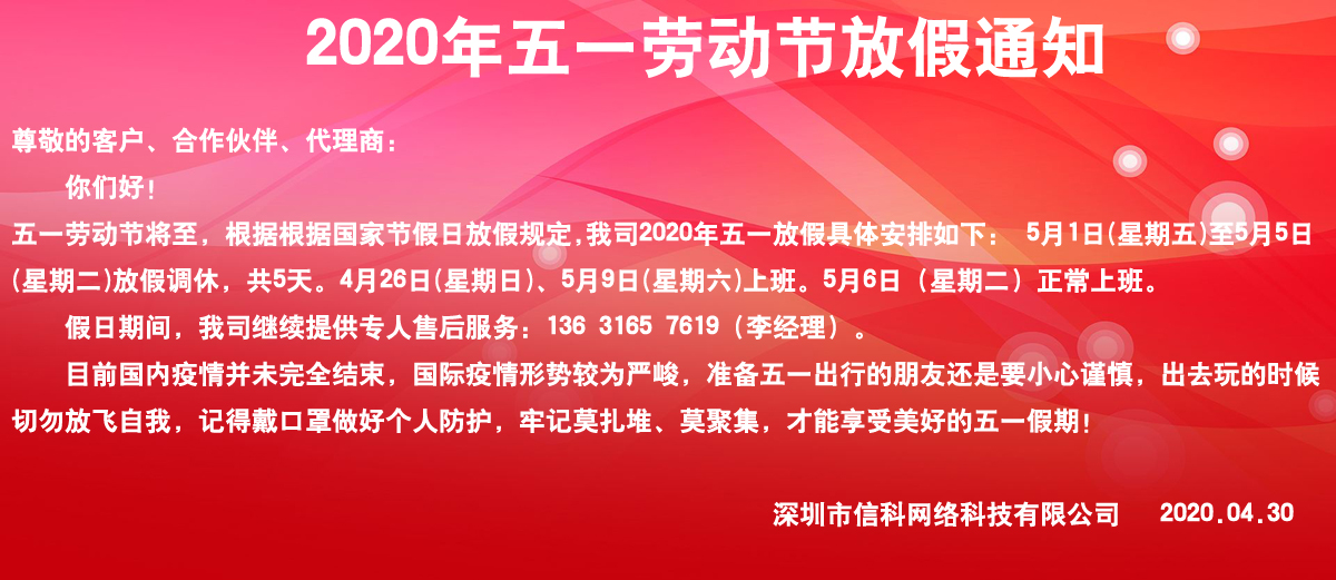 五一勞動節将至,根據根據國家節假日放(fàng)假規定,我司2020年五一放(fàng)假具體安排如下(xià): 5月1日(星期五)至5月5日(星期二)放(fàng)假調休,共5天。4月26日(星期日)、5月9日(星期六)上(shàng)班。5月6日(星期二)正常上(shàng)班。