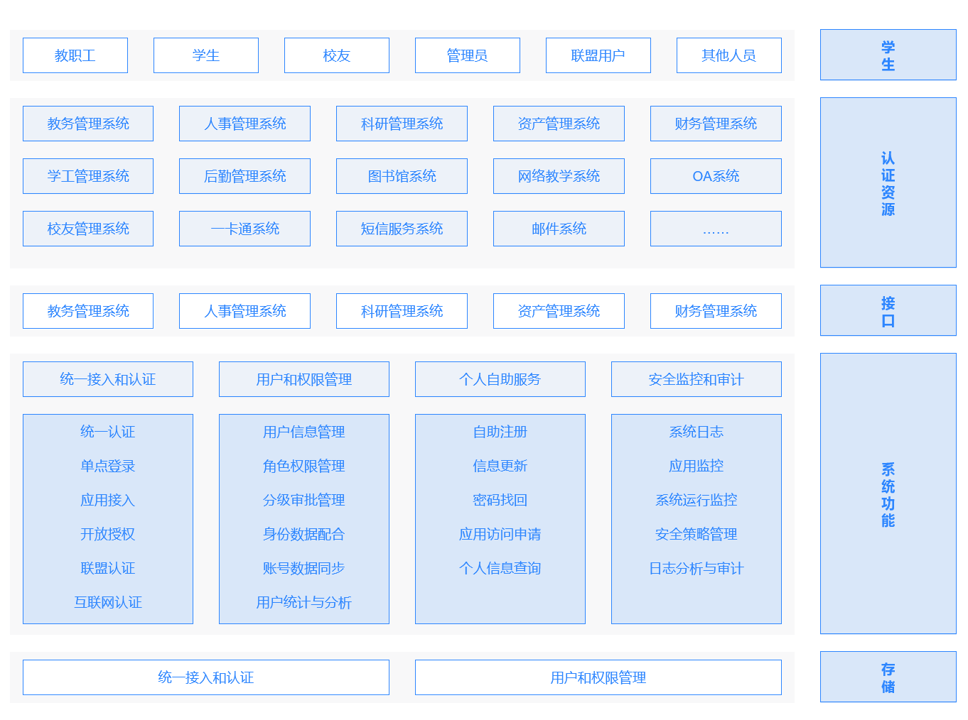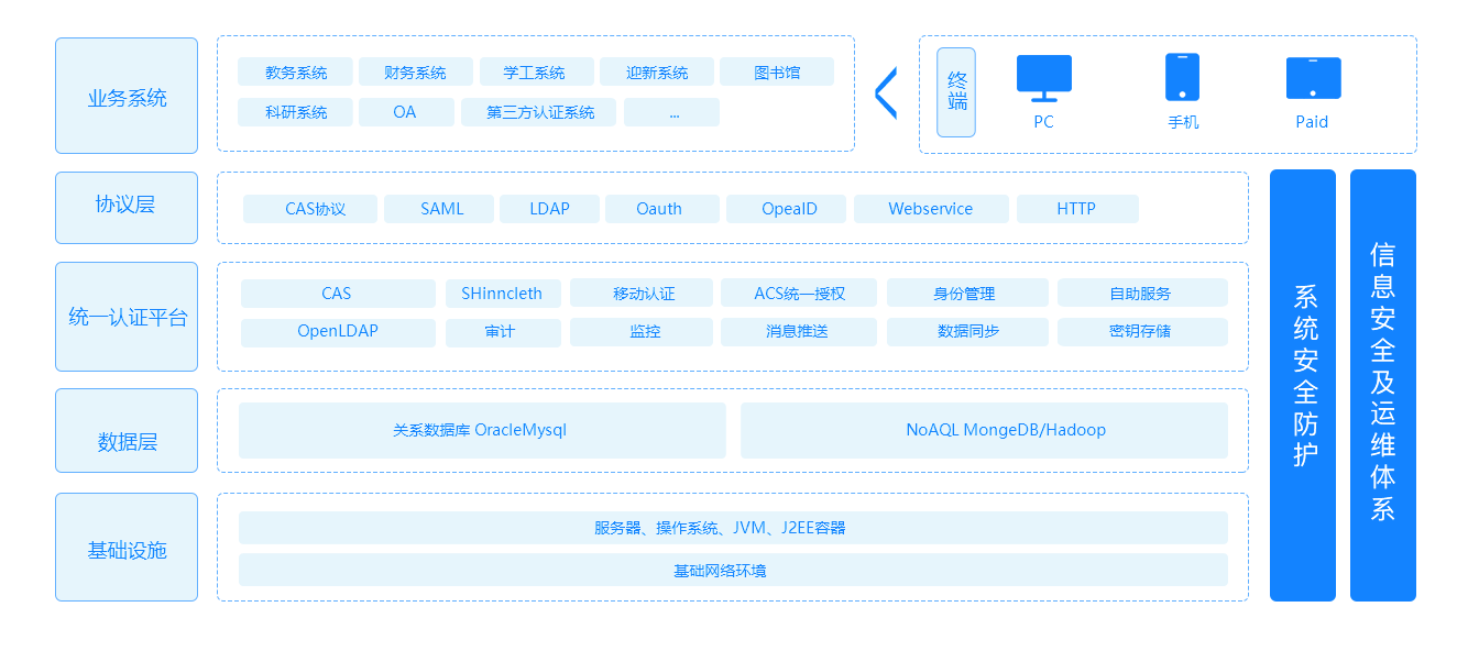 信科網絡統一身份認證服務平台,通過統一的賬号管理(lǐ)、權限管理(lǐ)、認證管理(lǐ)、審計(jì)管理(lǐ),對(duì)标互聯網技術實現(xiàn)與安全規範,解決高(gāo)校在“訪問控制、身份管理(lǐ)、業務授權、安全審計(jì)”四個方面存在的困擾和(hé)難題。實現(xiàn)師生賬号統一、數據安全共享、應用(yòng)集中管控、認證集中多樣等關鍵目标。