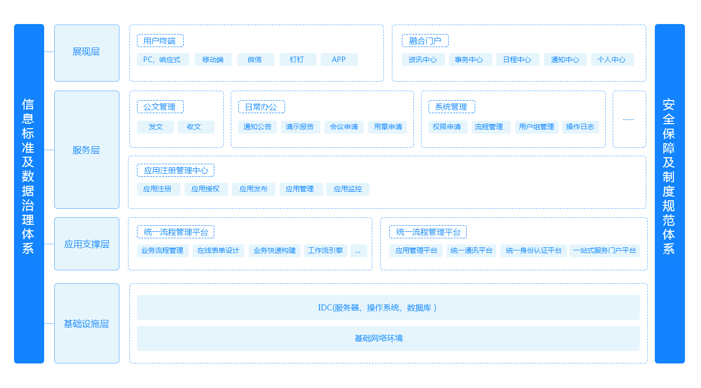 針對(duì)公文(wén)處理(lǐ)流程缺乏靈活性、辦文(wén)效率不高(gāo)、缺乏操作(zuò)監管與效能(néng)管理(lǐ)等校務工(gōng)作(zuò)問題,通過技術手段配合業務管理(lǐ),打破傳統按職能(néng)部門(mén)獨立建設管理(lǐ)系統的模式,圍繞校務服務,提供全方位視(shì)角的規劃與設計(jì)。