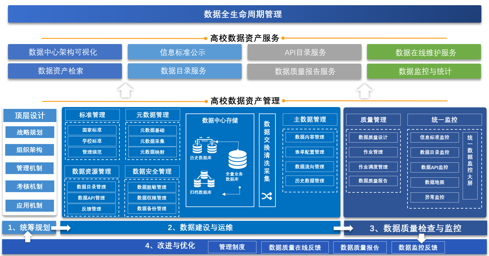 而目前的高(gāo)校,數據中心建設存在的大(dà)量的問題,難以滿足高(gāo)校在決策、管理(lǐ)、服務、流程優化、業務創新等多方面的要求。爲此,急需進行全面的數據治理(lǐ)。通過數據治理(lǐ)可重複的叠代過程,螺旋式上(shàng)升模型,實現(xiàn)數據資産的不斷沉澱、積累和(hé)質量的持續提升。 高(gāo)校數據中台的建設遵循技術與管理(lǐ)的相結合,貫穿在數據管理(lǐ)的過程中。建立科學有效的數據中台體系,對(duì)學校各業務系統和(hé)數據中心的數據質量實施全程、全域和(hé)全員的管理(lǐ)。将數據質量管理(lǐ)以制度化、規範化的方式落實到(dào)數據采集、存儲、清洗、生成、轉化、傳遞和(hé)使用(yòng)的各個過程環節之中,将會(huì)成爲學校信息化建設的一項重要工(gōng)作(zuò)。