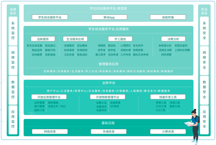基于微服務架構設計(jì)的學生事(shì)務一體化服務平台是智慧校園核心業務系統之一,更是高(gāo)校落實“以學生爲本” 的學生工(gōng)作(zuò)管理(lǐ)宗旨的重要幫手。以“管理(lǐ)+服務”的設計(jì)思想,涵蓋招生、迎新、學生工(gōng)作(zuò)管理(lǐ)、公寓、離校、就業、校友等服務,涉及學生入學前、入學時(shí)、在校期間、畢業以及畢業後的全生命周期管理(lǐ),從(cóng)學習、思想、生活等多維度記錄學生在校期間的各項信息;同時(shí)各子系統業務互相關聯,信息互聯互通,實現(xiàn)信息數據化、業務流程化、工(gōng)作(zuò)系統化等全過程一體化。打破時(shí)間、空(kōng)間的限制,既爲學生提供事(shì)務即時(shí)辦理(lǐ)服務;也(yě)爲高(gāo)校學生工(gōng)作(zuò)管理(lǐ)中心提供更高(gāo)效、快(kuài)捷的管理(lǐ)服務。