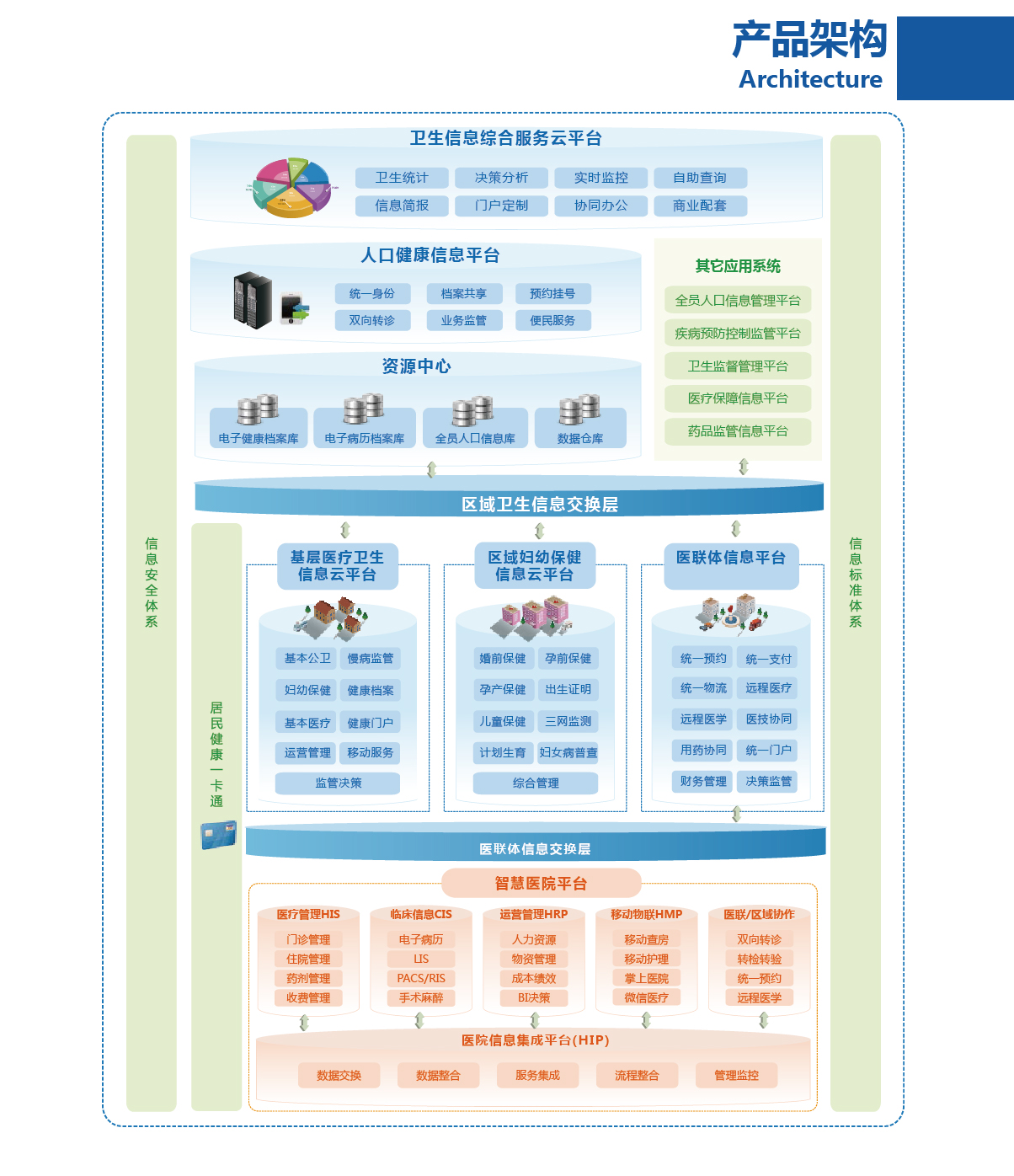 智慧衛生城(chéng)市是一個内涵豐富、結構複雜(zá)、功能(néng)完備、應用(yòng)廣泛的人口健康信息化系統工(gōng)程,涵蓋了(le)一個城(chéng)市範圍内與衛生計(jì)生行業相關的所有業務領域和(hé)行政管理(lǐ)的信息化。建設基于居民健康一卡通的現(xiàn)代診療服務體系,建立居民全程電子健康檔案,實現(xiàn)居民健康信息記錄一生,管理(lǐ)一生,服務一生,同時(shí)以健康信息的共享與應用(yòng)推動區(qū)域醫(yī)療協同的開(kāi)展,推動區(qū)域内預約診療、雙向轉診、分級診療、遠程醫(yī)療等業務協同新模式,有效利用(yòng)數據的分析、挖掘、預測爲政府科學決策提供支持,進而持續調整醫(yī)療服務模式及服務政策,有效緩解“看(kàn)病難、看(kàn)病亂、看(kàn)病貴”的難題,實現(xiàn)“惠民”、“惠政”、“惠醫(yī)”、“惠業”。