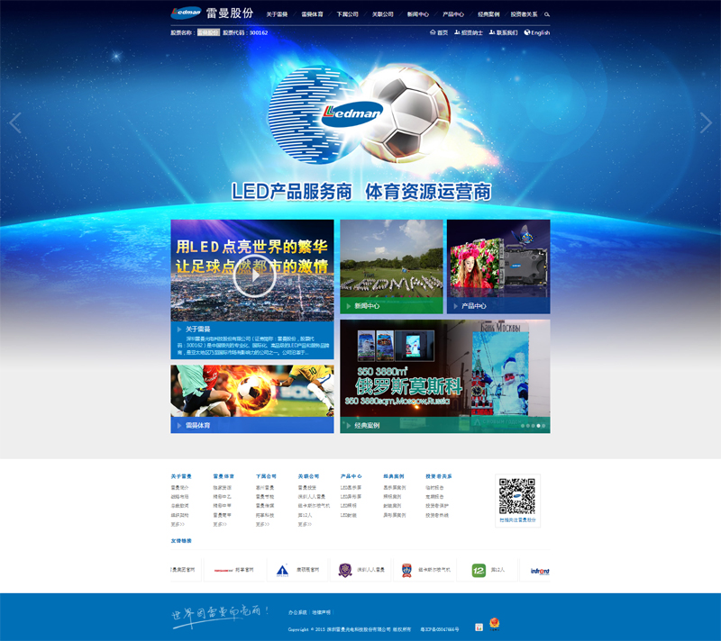 網站(zhàn):http://www.ledman.cn/深圳雷曼光電科技股份有限公司(證劵簡稱:雷曼股份,股票代碼:300162)是中國領先的LED産品服務商及體育資源運營商。公司沿革于1993年,成立于2004年,2011年在深交所創業闆成功上(shàng)市,是中國LED光電産業界的優秀标杆企業。目前公司以高(gāo)科技LE